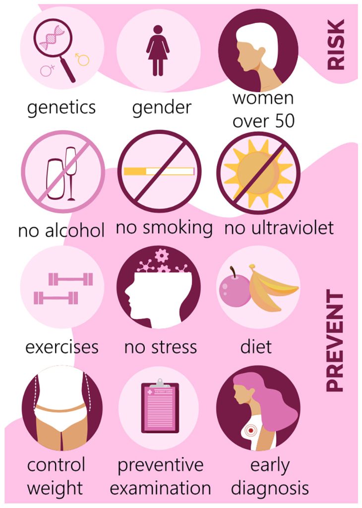 Major risk factors for breast cancer in women are age, genetic predisposition, and estrogen exposure. Women at risk for hereditary breast and ovarian cancer syndromes should be identified by healthcare professionals by thoroughly examining their personal and family history. Patients with concerning family history should be referred to a genetic counselor for a formal genetic assessment. If a female notices abnormal breast discharge, breast pain, skin changes on the breast, a breast lump or changes to the nipple, prompt evaluation by a health care provider should be done1.